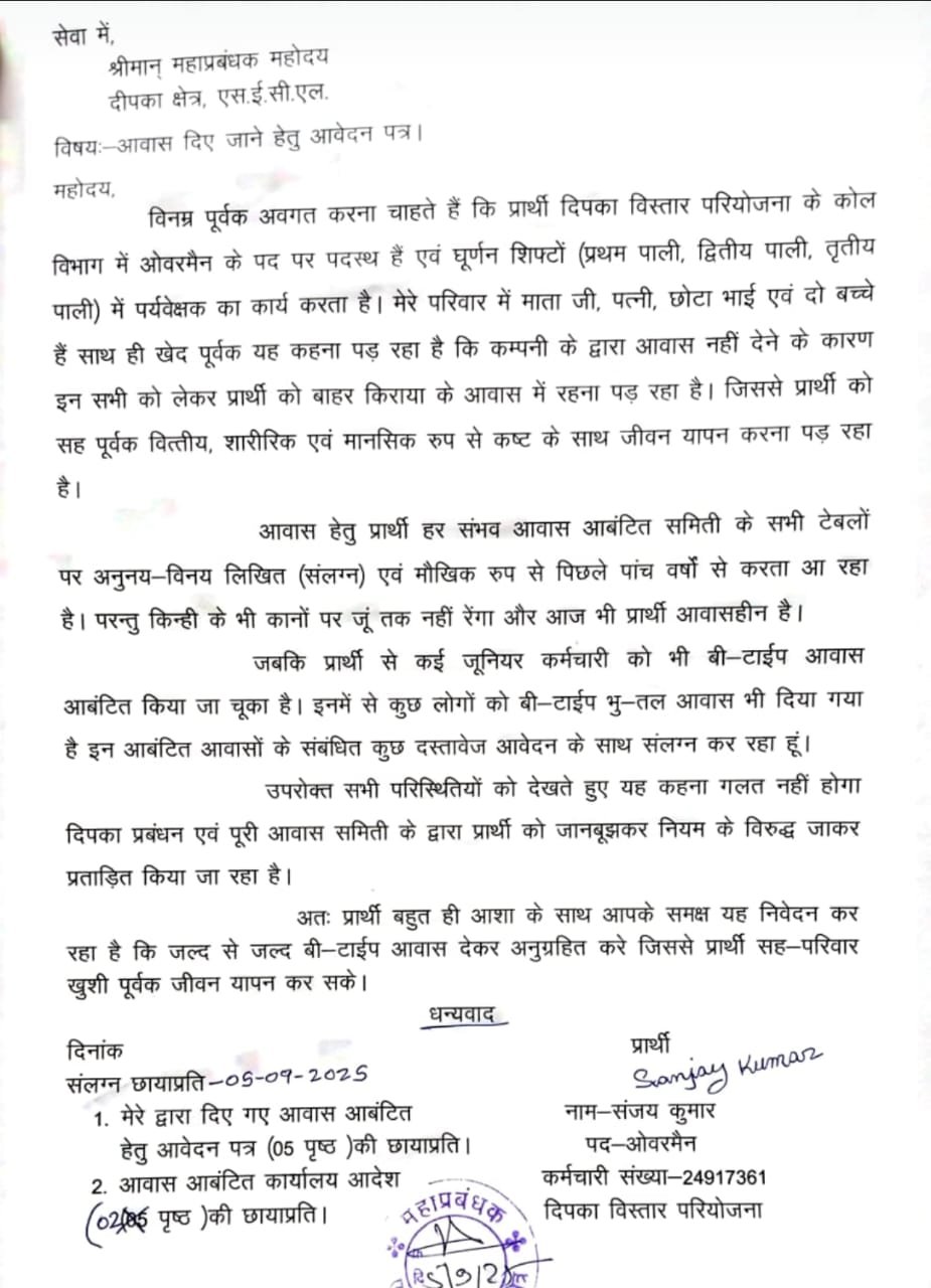 एसईसीएल दीपका क्षेत्र में आवास आवंटन को लेकर गंभीर अनियमितताओं का मामला सामने आया है। कोल विभाग में ओवरमैन के पद पर पदस्थ एक कर्मचारी ने महाप्रबंधक को लिखे पत्र में प्रबंधन पर जानबूझकर प्रताड़ित करने और नियम विरुद्ध कार्य करने का आरोप लगाया है।