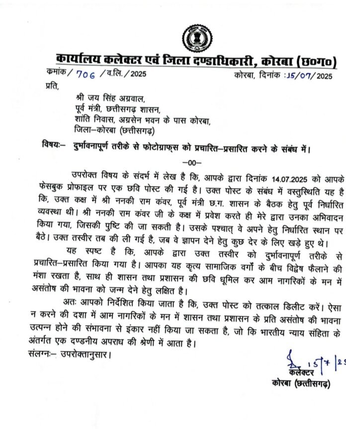 कोरबा के कलेक्टर अजीत वसंत ने पूर्व मंत्री जयसिंह अग्रवाल को जारी किया नोटिस