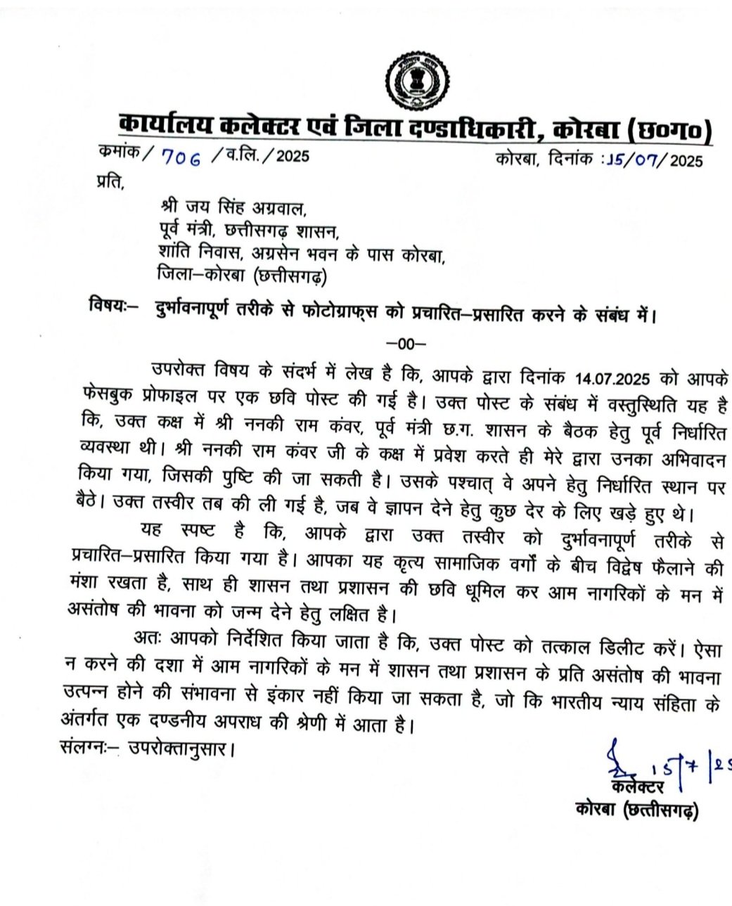 यह नोटिस जयसिंह अग्रवाल द्वारा अपने फेसबुक प्रोफाइल पर एक छवि पोस्ट करने के संबंध में है, जिसे कलेक्टर ने दुर्भावनापूर्ण तरीके से प्रचारित-प्रसारित करने का आरोप लगाया है।कलेक्टर अजीत वसंत का आरोप है कि जयसिंह अग्रवाल ने जानबूझकर तस्वीर को गलत तरीके से पेश किया।कलेक्टर ने कहा कि इस पोस्ट से सामाजिक वर्गों के बीच विद्वेष फैल सकता है और शासन व प्रशासन की छवि धूमिल हो सकती है।कलेक्टर ने जयसिंह अग्रवाल को पोस्ट तत्काल हटाने का निर्देश दिया है अन्यथा कानूनी कार्रवाई की चेतावनी दी है।