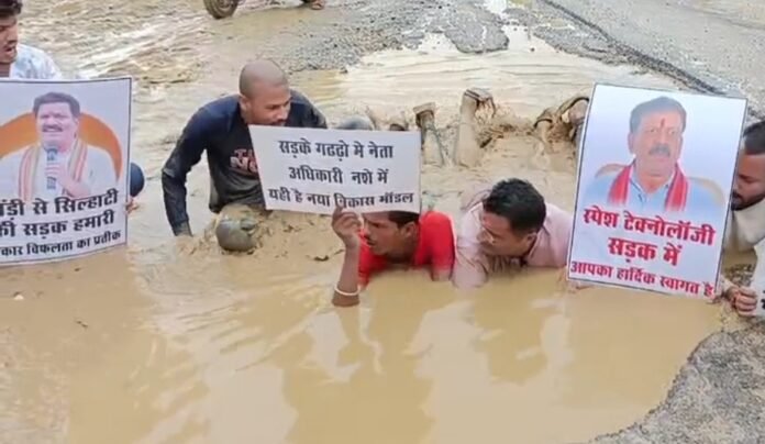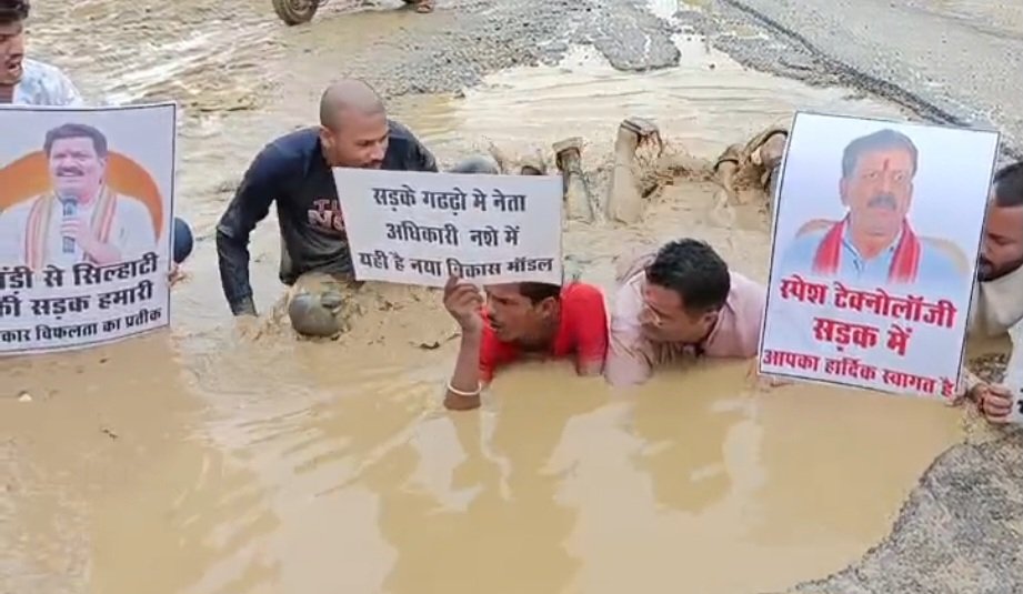 छत्तीसगढ़ के कवर्धा से होकर गुजरने वाले बिलासपुर जबलपुर नेशनल हाईवे की दुर्दशा पर कांग्रेसियों ने प्रदर्शन शुरू कर दिया कांग्रेसी कार्यकर्ता गड्ढों में लेट कर आक्रोश व्यक्त कर रहे हैं