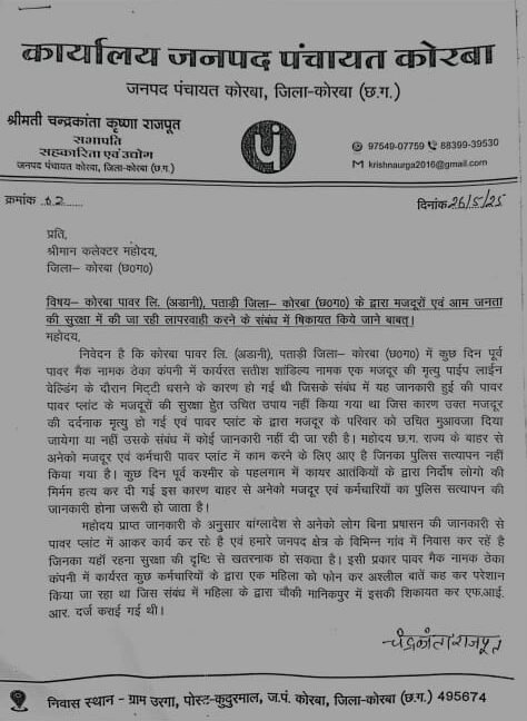 Acn18.comकोरबा/ छत्तीसगढ़ के औद्योगिक जिले कोरबा में 4200 करोड़ से खरीदी गई बिजली की नई परियोजना पर अदानी पावर काम कर रहा है। 2 दिन पहले यहां पर मिट्टी धशकने की घटना में 32 साल का वर्कर सतीश शांडिल्य घायल हो गया इसके बाद में मौत हो गई। इस घटना को लेकर सुरक्षा का सवाल खड़ा हो गया। जनपद पंचायत कोरबा में सहकारिता और उद्योग विभाग की सभापति चंद्रकांता कृष्णा राजपूत ने जिलाधिकारी को पत्र लिखकर मांग की है कि उद्योगों में सुरक्षा की स्थिति सुनिश्चित करने की आवश्यकता है। यह विषय व्यापक जनहित का है इसलिए प्रशासन को इस पर संज्ञान लेना चाहिए