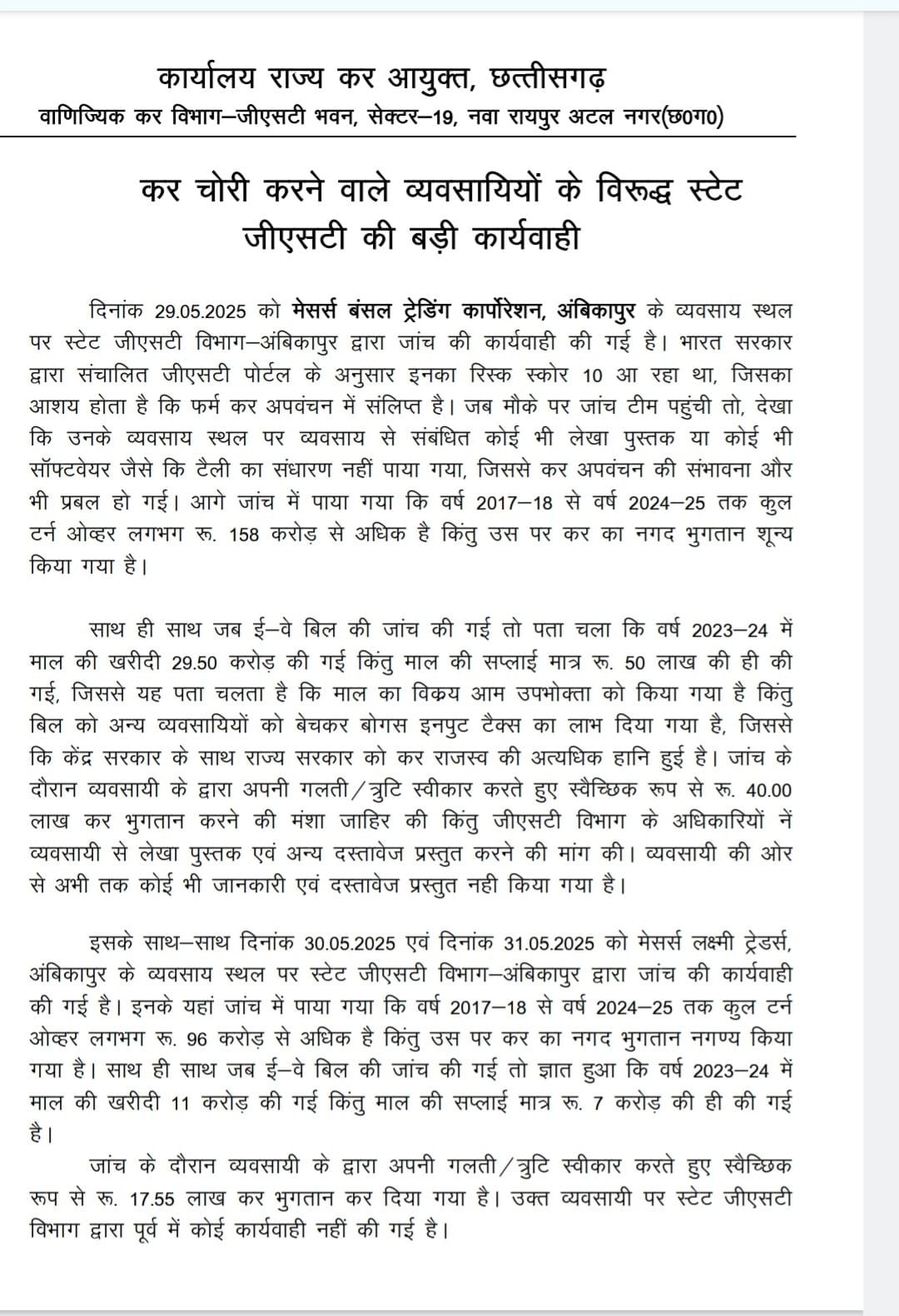 इसके साथ-साथ दिनांक 30.05.2025 एवं दिनांक 31.05.2025 को मेसर्स लक्ष्मी ट्रेडर्स, अंबिकापुर के व्यवसाय स्थल पर स्टेट जीएसटी विभाग अंबिकापुर द्वारा जांच की कार्यवाही की गई है। इनके यहां जांच में पाया गया कि वर्ष 2017-18 से वर्ष 2024-25 तक कुल टर्न ओव्हर लगभग रू. 96 करोड़ से अधिक है किंतु उस पर कर का नगद भुगतान नगण्य किया गया है। साथ ही साथ जब ई-वे बिल की जांच की गई तो ज्ञात हुआ कि वर्ष 2023-24 में माल की खरीदी 11 करोड़ की गई किंतु माल की सप्लाई मात्र रू. 7 करोड़ की ही की गई है।