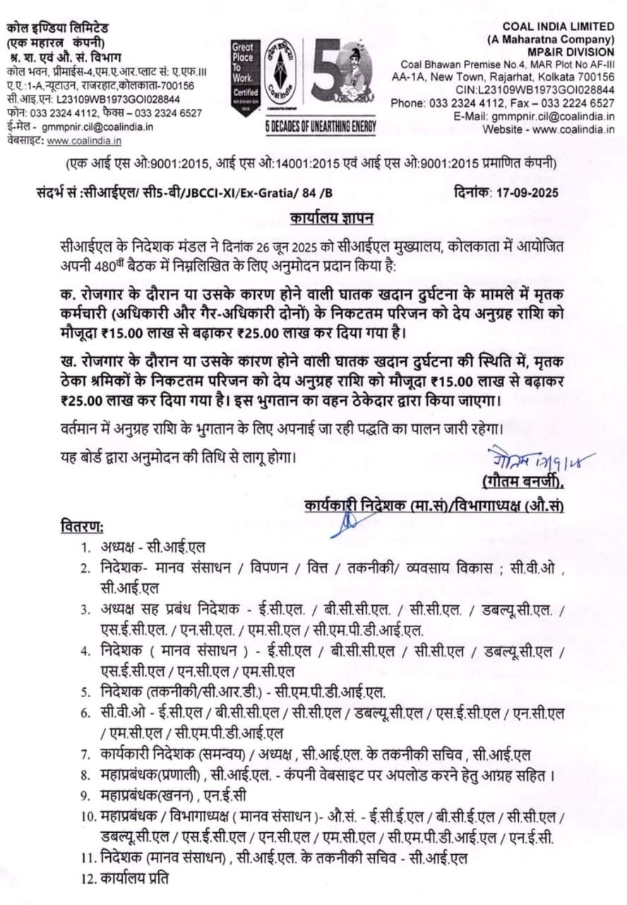 खनन हादसों पर बड़ा फैसला! मुआवजा राशि बढ़ाकर ₹25 लाख – सीआईएल निदेशक मंडल की ऐतिहासिक मंजूरी
