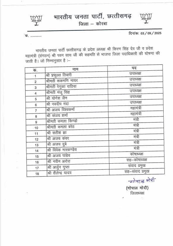 AstrologycrimeJOBKORBAUncategorizedखेलछत्तीसगढ़ज़रा हटकेजीवन शैलीज्ञान विज्ञानज्योतिषट्रैंडिंगदेश दुनियाधर्ममनोरंजनराम मंदिरवीडियोव्यापारसेहतख़ास ख़बर भाजपा कोरबा जिला अध्यक्ष गोपाल मोदी ने घोषित की कार्यकारिणी , 6 उपाध्यक्ष दो महामंत्री और 6 मंत्री बनाए गए देखिए सूची By KAMLESH YADAV 9425532015 - 03/09/2025 0 106 FacebookXPinterestWhatsApp Share Share