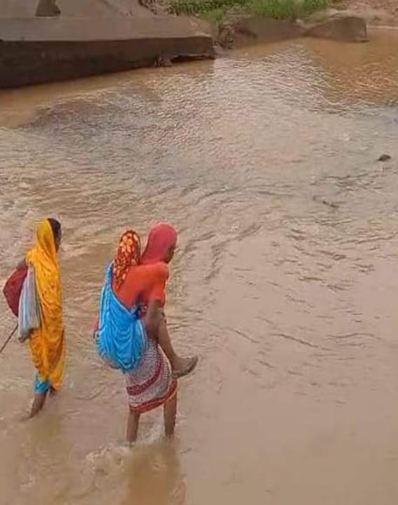 जशपुर जिले के मनोरा तहसील के सतालूटोली गांव के पास यह वाकया हुआ। जहां एक गर्भवती आदिवासी महिला मंजीता बाई को संस्थागत प्रसव के लिए अस्पताल ले जाने को मितानिन बिफनी बाई और दाई रेलों बाई सुबह 8 बजे लेकर निकलीं, लेकिन गांव को मुख्य सड़क से जोड़ने वाला पुल टूटा हुआ है और पक्की सड़क का नामोनिशान नहीं, रास्ते में मोबाइल नेटवर्क भी नहीं चलता और ऊपर से बारिश के चलते यहां के हालात इतने खराब है कि महिला को पीठ पर लादकर नदी पार करानी पड़ी।