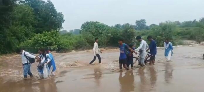 क्षतिग्रस्त रपटे पर जान जोखिम में डाल ,स्कूली बच्चे पहुंच रहे है स्कूल