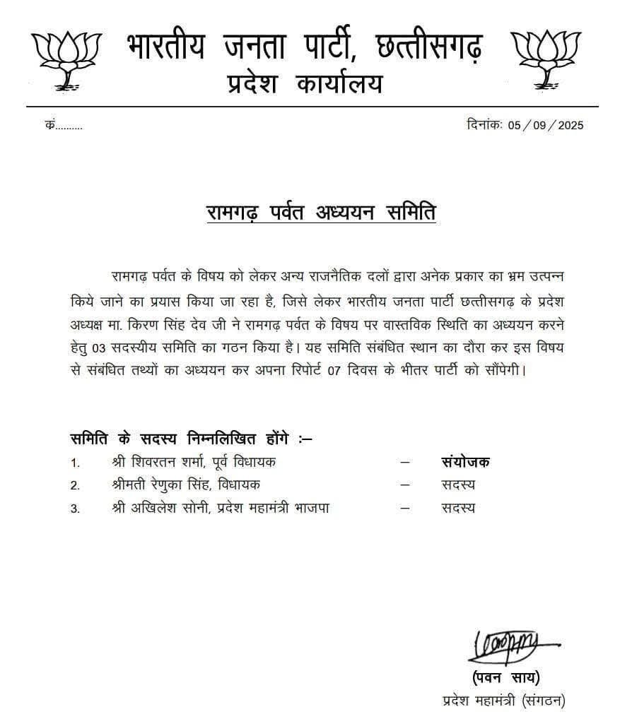पूर्व विधायक शिवरतन शर्मा बनाए गए हैं संयोजक, विधायक रेणुका सिंह और भाजपा प्रदेश महामंत्री अखिलेश सोनी सदस्य के रूप में टीम में रहेंगे शामिल