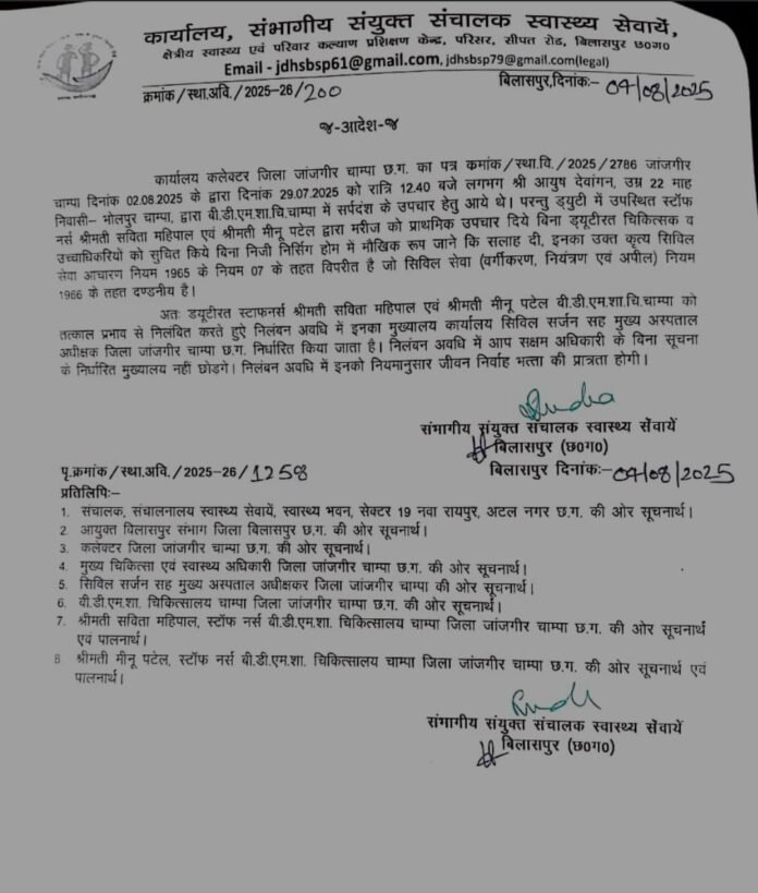 मामले को गंभीरता से लेते हुए स्वास्थ्य विभाग के संभागीय संयुक्त संचालक स्वास्थ्य सेवाएं डॉ. अनिल कुमार शुक्ला ने मामले का संज्ञान लिया और जांच के बाद अस्पताल की दो स्टाफ नर्स — मीनू पटेल और सविता महिपाल को तत्काल प्रभाव से निलंबित कर दिया।