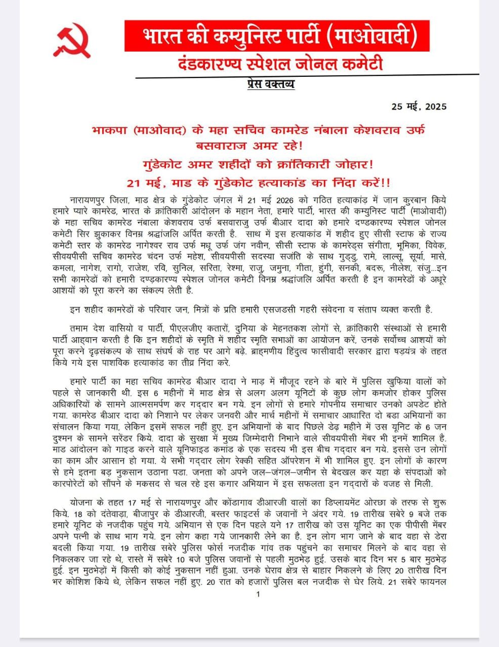 Acn18.comबीजापुर/ छत्तीसगढ़ के बीजापुर जिले के अबुझमाड़ में हुई भीषण मुठभेड़ को लेकर नक्सलियों की दंडकारण्य स्पेशल जोनल कमेटी के प्रवक्ता ‘विकल्प’ ने एक प्रेस नोट जारी कर बड़ा खुलासा किया है। विकल्प ने स्वीकार किया है कि इस मुठभेड़ में उनके संगठन के प्रमुख वसवराजू सहित कुल 28 नक्सली मारे गए हैं। उन्होंने यह भी बताया कि एक नक्सली का शव नक्सली अपने साथ ले गए हैं।