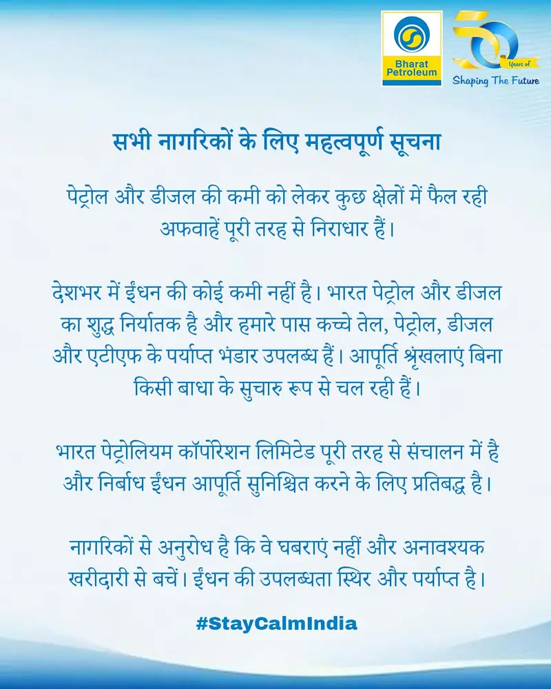 भारत पेट्रोलियम की ओर से जारी सूचना में कहा गया है कि कुछ क्षेत्रों में ईंधन संकट को लेकर फैलाई जा रही खबरें पूरी तरह निराधार हैं। कंपनी ने स्पष्ट किया कि उसके पास कच्चे तेल, पेट्रोल, डीजल और ATF (एविएशन टरबाइन फ्यूल) का पर्याप्त भंडार उपलब्ध है।