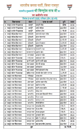 acc18.com रायपुर। सीएम विष्णुदेव साय की जन आशीर्वाद यात्रा 8 फरवरी को राजधानी रायपुर के 70 वार्डो से गुजरेगी यह यात्रा दोपहर 3.30 बजे भनपुरी चौक से आरंभ होकर जय स्तंभ चौक में रात्रि 7.00 बजे समाप्त होगी। लगभग 32 किलोमीटर की जन आशीर्वाद यात्रा में नगरीय निकाय चुनाव में भाजपा का कमल खिलाने की अपील करेंगे। इस यात्रा में महापौर पद की प्रत्याशी मिनल चौबे और 70 वार्डो से बीजेपी प्रत्याशी के साथ साथ बीजेपी कार्यकर्ता सम्मिलित होंगे।