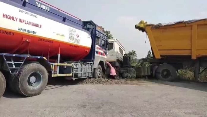 इंडियन आयल के टैंकर व ट्रेलर की टक्कर. दोनों गाड़ी के चालक घायल, 1 किलोमीटर लंबा जाम लगा