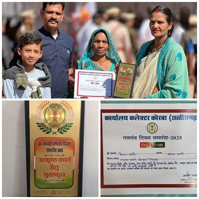 Acn18.com/गणतंत्र दिवस के अवसर पर कोरबा में आयोजित मुख्य समारोह में बरपाली निवासी स्वर्गीय प्रदीप महतो की धर्मपत्नी श्रीमती केवरा बाई को सम्मानित किया गया