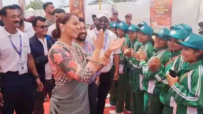 खिलाड़ियों से बातचीत करतीं ओलंपिक गोल्ड मेडलिस्ट गीता फोगाट