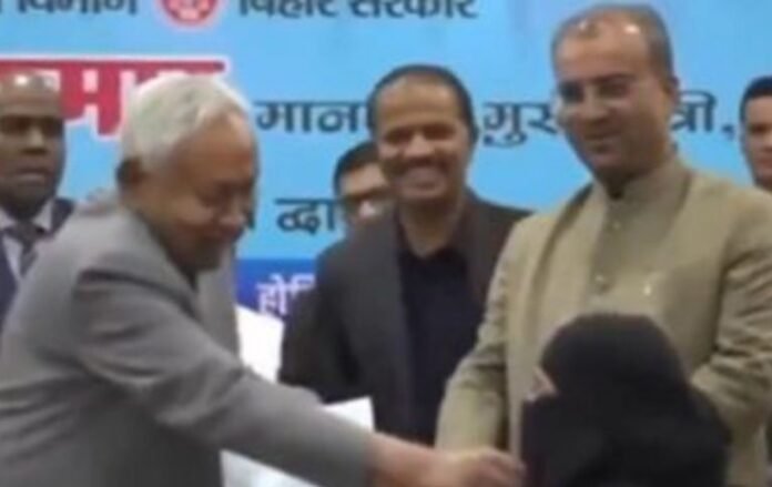 1. 15 दिसंबर 2025- नीतीश कुमार पटना में मुख्यमंत्री सचिवालय स्थित ‘संवाद’ सभागार में मुस्लिम महिला का हिजाब खींचते दिखे। एक वीडियो में दिख रहा है कि नीतीश कुमार नियुक्ति पत्र देते हुए एक मुस्लिम महिला आयुष डॉक्टर के चेहरे से हिजाब खींच रहे हैं। नीतीश कुमार के पीछे डिप्टी CM सम्राट चौधरी खड़े हैं और वीडियो में वह मुख्यमंत्री को ऐसा करते वक्त रोकते दिख रहे हैं। हालांकि, स्वास्थ्य मंत्री मंगल पांडेय के साथ मुख्यमंत्री के प्रधान सचिव दीपक कुमार हंसते दिख रहे हैं।
