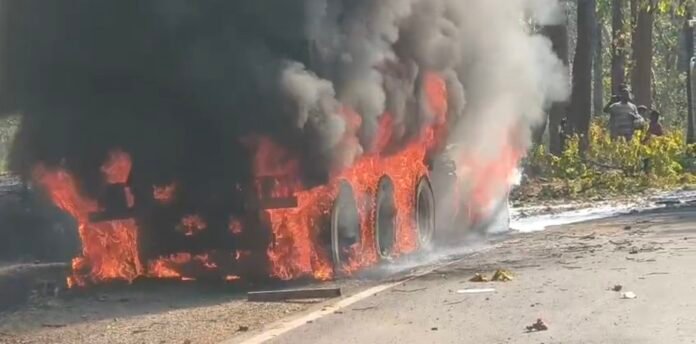 सड़क दुर्घटना के बाद ट्रक में लगी भीषण आग..दमकल के साथ पुलिस की टीम मौके पर..