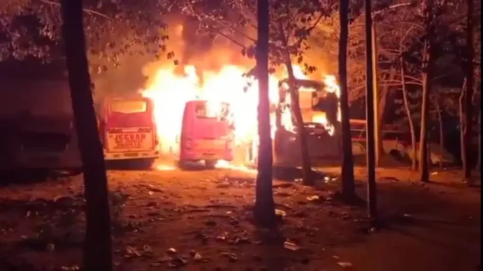 रायपुर। राजधानी रायपुर के ISBT में देर रात उस समय हड़कंप मच गया, जब बस स्टैंड परिसर में खड़ी कई यात्री बसों में अचानक आग लग गई। देखते ही देखते आग ने विकराल रूप धारण कर लिया और उसकी चपेट में आकर कुल 5 बसें पूरी तरह जलकर खाक हो गईं। घटना के बाद पूरे ISBT क्षेत्र में अफरा-तफरी का माहौल बन गया।