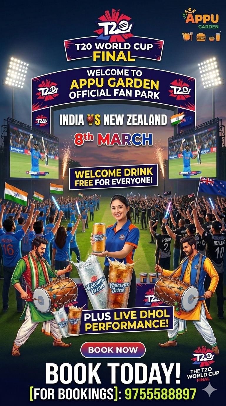 अप्पू गार्डन, जो अपनी सुंदरता और सुकून के लिए जाना जाता है, अब 8 मार्च को क्रिकेट के दीवानों के शोर और जोश से सराबोर रहेगा। प्रबंधन ने इस मेगा इवेंट को यादगार बनाने के लिए खास तैयारियां की हैं।