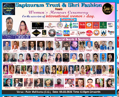 ACN18.COM महिला सम्मान समारोह का आयोजनआयोजन अंतरराष्ट्रीय महिला दिवस 8 मार्च शाम 5 बजे से Sapt Suram Trust & Shri Fashion द्वारा Palm Mall, कोरबा, छ.ग. में आयोजित किया जा रहा है। मुख्य अतिथि श्रम उद्योग मंत्री लखनलाल देवांगन और मुख्य विशिष्ट अतिथि मेयर श्रीमती संजू देवी राजपूत हैं। अन्य विशिष्ट अतिथियों में श्री जोगेश लाम्बा, श्री नरेंद्र देवांगन,श्री दिनेश मोदी,श्री जय सोनी,श्री विजय सोनी (J.K. ज्वेलर),श्री राजेंद्र सिंह राजपूत(DCT रियल स्टेट बिलासपुर),श्री गजेंद्र श्रीवास्तव श्री अमित पुरोहित क्लस्टर एडीटर (दैनिक भास्कर ),श्री प्रमोद झा, डॉ.डी.के आनंद (सेंट जेवियर स्कूल) डॉ.शोभराजचंदानी (NKH ग्रुप हॉस्पिटल),श्री.किशोर कुमार साहू( न्यू एरा पब्लिक स्कूल),श्री परेश वाघले( पराग टेलर)श्रीमती श्री तारकेश मिश्रा (किकबॉक्सिंग अकैडमी)। श्री किशोर दीपक चौधरी ( शारदा टेलीकॉम), श्री कमलेश यादव, (एसीएन न्यूज),श्री जितेंद्र फ्लोरा (होटल डिलीशियस) श्री बेद चंद्राकर (बेद इंडस्ट्री),श्री गुलशन अरोड़ा (शीला ग्रीन होटल),श्री शिव कुमार (आदिशक्ति शिव शक्ति संस्था), श्री सागर बत्रा (गृह शोभा),श्री संतोष कुमार मिश्रा (संतोष डेरी), कै.चन्द्रशेखर , श्री संजीव सिग, (शिवाशा फाउनडेशन), मनिष मिश्रा, रिशु पी. सैनी( स्मार्ट बजार ),सप्त सूरम टीम से शशी सिन्हा,रिंकू दास,प्रतिमा धोष, सोनाली जयसवाल सहयोगी है.